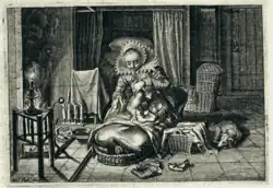 3, portraying Vanitas, depicts no direct image of vanity but takes a contrary approach, featuring a well-dressed upper-class women holding a child who's just loaded his diaper--"the child's bottom, ready for wiping, is thrust directly into the viewer's face".[6]