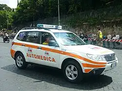 Physician emergency response vehicle have the same graphic elements of ambulances except for the front word AUTOMEDICA or SOCCORSO SANITARIO ("Medical Emergency [Service]"). This last term has recently been used in some regions because some of the ALS vehicles are staffed by a physician and a nurse, while other vehicles are staffed with two nurses ("Automedica" literally means "Physician car", so it would be a misguiding name for nurse-only staffed units).[12]