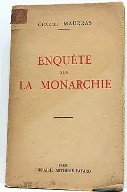 Enquête sur la monarchie (Inquiry into the Monarchy) is a book by the French politician Charles Maurras, journalist at the Revue d'Action française then director of L'Action française, first published in 1900 in the Gazette de France. Enquête sur la monarchie is the starting point for a renewal of the royalist movement in France. A revival based on the development of a new doctrine "which replaces the old parliamentary and conservative royalism with a conception of monarchy that aims to be traditional and nationalist",[1] and the symmetrical development of the Action française born in 1899.