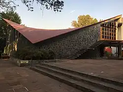 Once again, Félix Candela worked alongside De la Mora as the project's advisor. The base of this parish was built with reinforced concrete, but in order to get De la Mora's signature lively roof, it had to be lamellar reinforced with 4 centimeter thick concrete.[11] Within the church is a place called the Refuge for Pilgrims which cannot be seen from outside, but only upon entering the building can it be seen. The building then transforms into a body as its main entrance tunnels the viewer's line of sight towards the heart of this private space located down a set of stairs.[7]