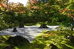 The gardens of Entsū-in are divided into four areas: a karesansui garden; a moss garden around a pond shaped like the character for heart (心), attributed to Kobori Enshū; a rose garden inspired by the Date encounter with the Christian west; and a natural stand of cryptomeria. In autumn the temple is celebrated for its momiji.[7][8]