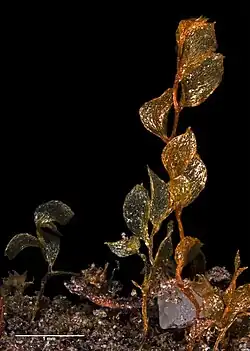 Epipterygium are found in humid and warm regions, mainly in Central America.[4] Epipterygium opararense is the only Epipterygium moss that grows in Australasia.[5] It has 1/2 phyllotaxy (leaves are located one above the other, rotated 180°), which is unique for the genus, which usually has 2/5; it is probably an evolutionary adaptation to the darkness of the habitat.[6] The colour of the plants is pale green or brownish-green, while individual stalks have a yellow or red shade of brown.[7] Several 15-mm unbranched stalks with distichously arranged single leaves grow from a common point.[7] The leaves are elliptic; their dimensions are 1.5–2.1 × 0.7–0.85 mm; the closer they are to the base, the smaller they become.[8] The moss is dioicous and has no sporophytes.[9] The moss seems to be stable on granite surfaces but not elsewhere: it forms only ephemeral colonies in decaying tree trunks; the scarcity of granites in New Zealand might be the reason why the moss is so rare.[10][1]