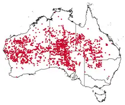 The subspecies latrobei and glabra are widespread, occurring in Western Australia, the Northern Territory, South Australia, Queensland and New South Wales, although in New South Wales, subspecies glabra is only found in the far north-west corner of the state, near Tibooburra. Both subspecies grow in a wide range of habitats and vegetation associations but subsp. latrobei favours mulga and mallee woodland and subsp. glabra prefers sand plain.[2]