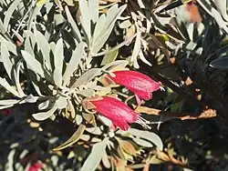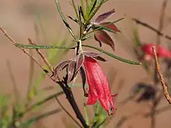 Eremophila latrobei, commonly known as crimson turkey bush, native fuchsia, Latrobe's emu bush, grey fuchsia bush, warty fuchsia bush and Georgina poison bush[2] is a flowering plant in the figwort family, Scrophulariaceae and is endemic to Australia. It is an erect, highly branched shrub with usually linear leaves and red to purple-red flowers and which occurs in all mainland states, including the Northern Territory but excluding Victoria.