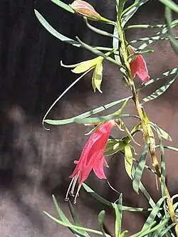 • Eremophila latrobei subsp. glabra (L.S.Sm.) Chinnock[10] which has flat leaves (rather than thread-like leaves) and glabrous sepals;[2][3]