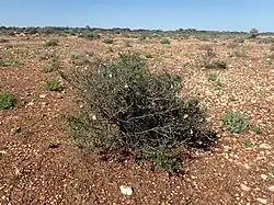 Spiny poverty bush grows in sand, clay or loam soils between Wiluna and Carnegie Station[3] in the Gascoyne, Little Sandy Desert and Murchison biogeographic regions.[6]