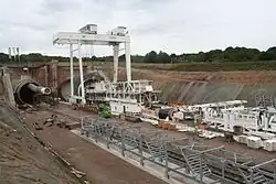 The Finne Tunnel was structurally complete in the spring of 2012. The earthworks of the 30 km (19 mi) long section in the Thuringian basin was completed in June 2012. The construction site was connected via a construction track to the Erfurt node, so that the installation of the slab track, the catenary, the electrical engineering and the train control and protection systems could be started in this section.[75] The Saale-Elster Viaduct and Osterberg Tunnel were completed by 2012.