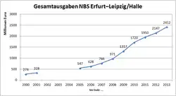 Around 1992, the planned costs of option 1 were estimated at DM 4.4 billion.[42] Early in 1993, the cost of the 194 km comprehensive overall project, which at that time also included the Bitterfeld–Leipzig and Bitterfeld–Halle sections, was stated to be D-Mark 5.54 billion. The targeted ICE traveling time between Leipzig and Erfurt was stated to be 39 minutes. Construction was planned to start in 1994, with the commencement of operations in 1999/2000.[36] When construction started in 1994, the commissioning was still foreseen in 2000, at a total cost of DM 4.5 billion as estimated in January 1994.[41] In mid-1994, the planned investment was estimated at DM 4.592 billion (gross). Contracts for building the line would be awarded in eleven lots.[18]