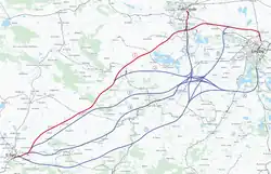 - Option 3 foresaw a southern course in the Großkorbetha area. A branch would run from there, parallel with the autobahn, to the airport. In addition, there would be an upgrade of the existing line towards Merseburg and Halle.[37] The 123 km (76 mi)-long route was calculated to cost DM 6.6 billion.[18]