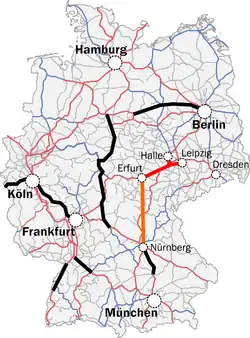 It is listed in Germany's Federal Transport Plan (Bundesverkehrswegeplan) as "German Unity Rail Project no 8.2" (Verkehrsprojekt Deutsche Einheit Schiene, VDE 8.2) and is a section of the Munich–Berlin high-speed route, part of the Line 1 of Trans-European Transport Networks (TEN-T)[6] and on the east–west axis between Dresden and Frankfurt. To the north, it connects with the previously completed Berlin-Halle and Leipzig railways (VDE 8.3) and to in the south with the Nuremberg-Erfurt high-speed railway (VDE 8.1), which was opened in December 2017. The travel time from Munich to Berlin has been reduced to about four hours.[7]