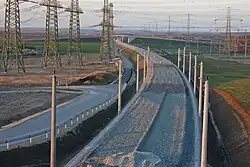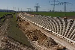 In January 2009, Deutsche Bahn called construction tenders for the subgrade of the ballastless section 2 (track-km 197.889 to km 215.937) and the ballastless section 3 (km 215.937 to km 228.685). Both contracts were to run from June 2009 to the end of April 2012.[50][51] At the end of May 2009, this was followed by the invitation to tender for the contract for the ballastless section 4 (km 251.1 to km 272.1) as well as the ballastless section 5 including the Gröbers junction (km 279.9 bis km 286.9). These contracts were to run from November 2009 to November 2012 (lot 4) and from July 2010 to December 2015 (lot 5).[52][53][54] In July 2009, finally, the integration of the line into the Erfurt junction was tendered, which would be built between December 2009 and December 2010.[55] In July 2011, a contract worth €200 million was awarded for the production of slab track and for 22 kilometres (14 mi) of noise and wind barriers between Erfurt and Gröbers. This work would be completed by the end of 2013.
