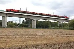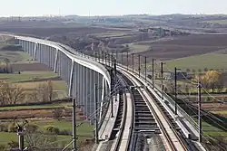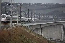 The design speed is largely 300 km/h (186 mph), reduced to 160 km/h (100 mph) on the branch to Halle.[8] 15.4 km (9.6 mi) of the 123 km (76 mi)-long high-speed line is located in three tunnels; the six viaducts of the route together are more than 14.4 km (8.9 mi) long.[9] With a length of approximately 6,465 metres (21,211 ft), the Saale-Elster Viaduct is the longest bridge structure in Germany and the longest bridge on a long-distance railway in Europe. The Unstrut Viaduct at 2,668 m (8,753 ft) is the second longest railway bridge in Germany.