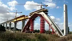 The maximum height of embankments is 15 m (49 ft 3 in) and the maximum depth of cuttings is 20 m (65 ft 7 in) (DB guideline 836). Bridges and tunnels were provided where these values could not be complied with.[15] Overall, 35 rail bridges and 39 road bridges were built in the course of the project.[8] A special feature is the design of four major bridges as "semi-integral" bridges. The pier and superstructure are monolithically connected, but, in contrast to integral bridges, there are joints in the superstructure.[16]