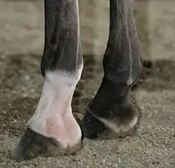 Like the chestnut, the ergot is thought to be a vestige of some part of the ancestral foot of the multi-toed Equidae, the ergot corresponding to the sole pad of other extant members of Perissodactyla, such as the tapir and rhinoceros.[1] Unlike the chestnut, which in the same individual may be large on the forelegs and smaller or even absent on the hindlegs, according to Ridgeway,[1] the ergot is of roughly equal size on all four legs. However, as stated above, it is often noted that the ergot can be absent on some or all legs.