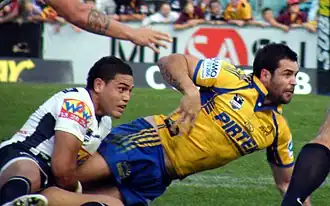 In the 2007 NRL season, Grothe made 23 appearances and scored 11 tries as Parramatta finished 5th and qualified for the finals. Grothe played in the club's 26-10 preliminary final loss against Melbourne in which Grothe scored a try.[7] In the 2008 NRL season, Grothe scored six tries in ten games but was demoted to reserve grade midway through the season by coach Michael Hagan. Grothe also learned that he was free to negotiate with other clubs as Hagan had told him he was not in Parramatta's plans for 2009.[8]