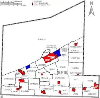 Map of Erie County, Pennsylvania, with Municipal Labels showing Cities and Boroughs (red), Townships (white), and Census-designated places (blue).