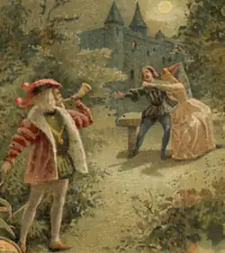 Ernani enters disguised as a pilgrim. He asks for shelter, which Silva grants him, and then learns from Silva that he is about to marry Elvira, who believes Ernani to be dead. Ernani reveals his true identity to everyone, begging to be handed to the king. Silva however decides to keep his word and protect Ernani. The bandit then confronts Elvira, who tells him that she was planning to kill herself at the altar (Duet: Ah, morir potessi adesso / "Ah, if I could die now"). Silva walks in, discovering the pair, and furiously decides to kill Ernani. However, he is stopped by one of his men, Jago, who tells of the impending arrival of the king. Silva decides to hide Ernani and exact his vengeance on him later. (Trio: No, vendetta più tremenda / "No, I want to keep a greater revenge"). Carlo arrives and wishes to know why the castle is barred. Silva refuses to surrender Ernani (Carlo's aria: Lo vedremo, veglio audace / "We shall see, you bold old man") and Don Carlo's men cannot find Ernani's hiding place. Silva keeps his word, even when the king secures Elvira as a hostage. Finally alone, Silva releases Ernani, challenging him to a duel. Ernani refuses to fight, pleading to see on last time Elvira and die. After Silva reveals that the king has taken her as hostage, Ernani reveals that Carlo loves Elvira, too. After that, Silva is convinced to posticipate again his revenge on Ernani. They join forces to retrieve Elvira and kill Carlo. Therefore, Ernani swears to die whenever Silva will sound a horn he gives to him. ("Se uno squillo intenderà, tosto Ernani morirà" / "If Ernani will hear a sound, Ernani will die at moment")