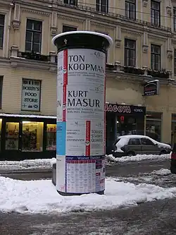 A Litfaßsäule in Vienna, Austria. The advertisements are for concerts with Ton Koopman and Kurt Masur respectively; at the bottom there is the weekly programme of the theatres of Vienna.