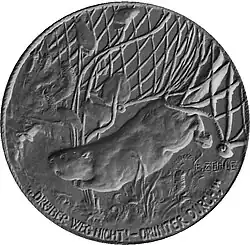 During the First World War Zehle cast a series of commemorative medallions to celebrate the return of German submarine Deutschland following its successful penetration of the British naval blockade in the summer of 1916. These were dedicated to Lord Cecil, the British Minister responsible for the blockade, and featured an image of a beaver swimming under a net with the phrase "DON'T GO OVER! GO UNDER!".[4] He would also create other medallion series dedicated to service dogs and their handlers.[5]