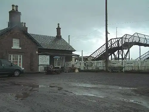 Both the station house and the 1877 signal box still survive, each being listed structures.[2] The latter also operates a barrier level crossing.
