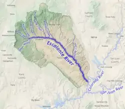 The Escalante River is a tributary of the Colorado River. It is formed by the confluence of Upper Valley and Birch Creeks near the town of Escalante in south-central Utah, and from there flows southeast for approximately 90 mi (140 km) before joining Lake Powell. Its watershed includes the high forested slopes of the Aquarius Plateau, the east slope of the Kaiparowits Plateau, and the high desert north of Lake Powell. It was the last river of its size to be discovered in the 48 contiguous U.S. states.[1] The average discharge is approximately 146 cfs (4.1 m³/s).