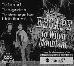 Escape to Witch Mountain is a 1995 American fantasy-adventure television film written and directed by Peter Rader. It is a remake of the 1975 film of the same name.[2] The film was announced by American Broadcasting Company (ABC) in September 1994, as the third of four Disney film remakes to air on the channel, the other three being The Shaggy Dog, The Computer Wore Tennis Shoes, and Freaky Friday.[3][4] The film was produced by Walt Disney Television and premiered on ABC on April 29, 1995,[5] as an ABC Family Movie.