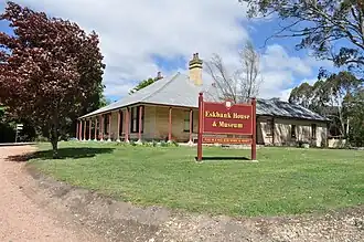 In 1841–1842, just east of what is now the Lithgow city centre, Brown built a well-capitalised homestead complex named Esk Bank House. Situated on a low rise, it consisted of an elegant single-storey sandstone ashlar-coursed dwelling and outbuildings. Its construction appears to have been supervised by Alexander Binning, a Scottish stonemason.[7][8][9] The stone for Esk Bank House appears to have been quarried at Burton's Quarry, located on the eastern ridge of the Lithgow Valley. Construction was assisted by convict labour.[10] The homestead's water supply was by agency of a subterranean tank fed by roof water. The grounds of Esk Bank House were, at this time, characterised by a sweeping, wide, circular gravelled carriageway, linked to the front and side verandahs by paths between ornamental garden beds. Fencing constrained the domestic livestock and protected extensive vegetable gardens, as well as ornamental garden beds, from intrusion. Plantings were characterised by English deciduous trees, as well as by evergreens such as conifers.[1][11]