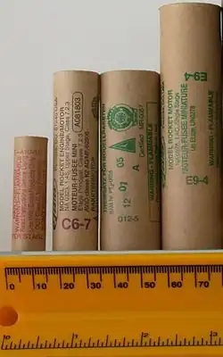 Estes produces single-use engines with compressed black powder propellant. They come in industry-standard sizes of 13mm (1/4A through A), 18mm (1/2A through C), 24mm (C through E), and 29mm (E and F) in diameter. The engines are constructed within a sturdy cardboard tube. Inside are placed a clay nozzle, solid propellant, delay charge, ejection charge, and a clay retainer cap.