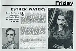 Esther Waters is a British period television series which originally aired on BBC 2 in four episodes from 14 November to 5 December 1964. It is an adaptation of the 1894 novel of the same title by George Moore.[1] Like the novel it focuses on the struggle of Esther Waters who, in Victorian England, is abandoned by her lover when pregnant. Despite the social stigma of being a fallen woman she chooses to raise the child as a single mother.