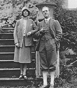 He decided to devote his life to literature and wrote many notable novels. In 1920 they went to live in Capri and became friendly with other famous authors of that time such as D. H. Lawrence. In 1929 he returned to England and rented Esthwaite Lodge. During the time he lived here he wrote “Black Roses”, "Jim Redlake" and "Mr. and Mrs. Pennington". The popular illustrated magazine called “the Sketch” visited the couple on two occasions during their residence at the Lodge and photographed them sitting on the front wall of the house and standing near the front steps. The photos are shown. The Grecian vases have since been removed but the pedestals on which they stood still remain.