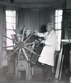 Gabain's WAAC commissions allowed her to explore her interest in the innovative medical techniques which were being developed during the war. In 1944, as well as depicting Sir Alexander Fleming working in the laboratory where he had discovered penicillin,[18] Gabain also recorded, in A Child Bomb-Victim Receiving Penicillin Treatment, a young girl being treated with the drug.[19][20] She recorded pioneering treatments of burns victims, including the introduction of a new continuous irrigation method.[14]