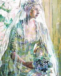 Whilst living and working in Paris Gabain began to work on a theme centred on ‘melancholic young females.’ She produced numerous lithographic images of a lonely young female. Gabain revisited this theme later on in her career and produced several different images of a sad young bride. She always used her favourite model, Carmen Watson, in these depictions. By the time Carmen was married in 1940 she had posed over sixty times for Gabain. It was through an earlier image, The Striped Petticoat, that she met Harold J. L. Wright of Messrs. Colnaghi and Co. He saw this lithograph and contacted Gabain to ask her if Colnaghi's could become her publishers. This led to a lifelong friendship.