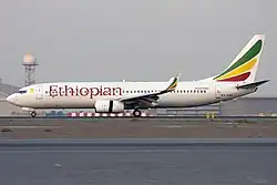 The aircraft involved was a Boeing 737-8AS, registration ET-ANB, s/n 29935.[1][6] It first flew on 18 January 2002, and was delivered new to Ryanair on 4 February 2002 as EI-CSW. Stored in April 2009, Ethiopian Airlines took delivery of the aircraft on 12 September 2009, leased from CIT Group.[3] Provided with twin CFM International CFM56-7B26 powerplants, the airframe last underwent maintenance checks on 25 December 2009 without any technical problems found.[3][7] It was 8 years and 7 days old at the time the accident took place.