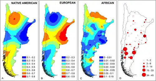 - ^ Avena; et al. (2012). "Heterogeneity in Genetic Admixture across Different Regions of Argentina". PLOS ONE. 7 (4): e34695. Bibcode:2012PLoSO...734695A. doi:10.1371/journal.pone.0034695. PMC 3323559. PMID 22506044.