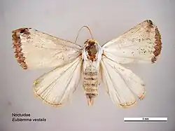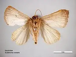 1. ^ Savela, Markku (2 August 2019). "Eublemma vestalis (Butler, 1886)". Lepidoptera and Some Other Life Forms. Retrieved 17 November 2019.