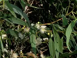 The flowers are arranged in unbranched groups of seven in leaf axils on a peduncle 3–8 mm (0.1–0.3 in) long, the individual buds on a pedicel usually up to 3 mm (0.1 in) long. The mature buds are green with a red tinge, oval to spindle-shaped, 4–5 mm (0.2–0.2 in) long, 3–4 mm (0.1–0.2 in) wide with a conical operculum. Flowering occurs in winter and the flowers are white. The fruit is cup-shaped to hemispherical, 5–7 mm (0.2–0.3 in) long and 7–9 mm (0.3–0.4 in) wide. The leaves are dark green on both sides, with prominent veins. Flowering occurs from January to March and the flowers are white. The fruit is a woody, conical to hemispherical capsule 3–4 mm (0.1–0.2 in) long and 4–7 mm (0.2–0.3 in) wide.[3][4][5]