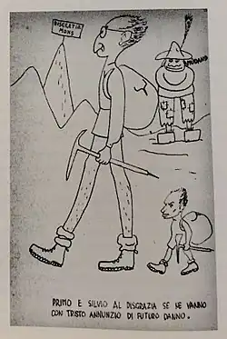 Tedeschi's sketch of Primo Levi leading the way on a hike in the Alps.