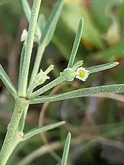 Euphorbia angusta is a leggy erect branching herb that grows up to 40 centimeters tall. It has linear opposite leaves that arise from slightly swollen stem nodes. Both stems and leaves are covered sparsely with white hairs. Small single white flowers arise near leaf nodes and are composed of small but showy involucral gland appendages with toothed margins.[3]