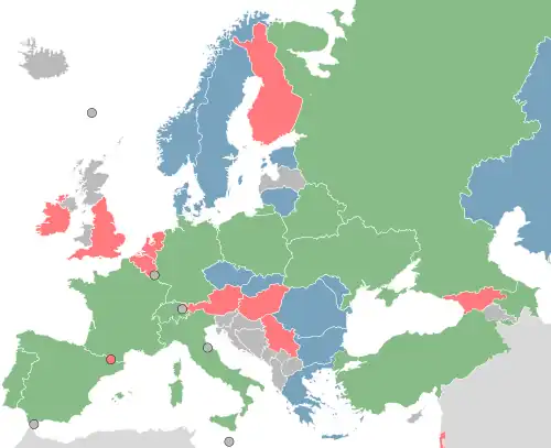During this era participation has continued to increase, breaking the 20-team barrier in 2011 and a record 27 nations competed in 2017, seeing participation expand to some of Europe's least populated nations such as Lithuania and Andorra, and to the continent's most eastern periphery with Azerbaijan and Kazakhstan debuting and becoming league regulars.[26] The Superfinal and regular season stages have also spread out further across Europe; the former has been staged in Estonia,[27] The Netherlands[28] and Russia,[29] whilst the latter have been hosted in Serbia,[30] Hungary[31] and Ukraine.[32] Russia's rise culminated with their first title in 2009; with four further titles since, Russia equalled Spain and Portugal's long standing record tally of five titles in 2017,[33] and at least finishing in the top four every season from 2007–19, the Russians have cemented their position as a superpower. During this period Portugal have continued to be a dominant side, becoming only the second team after Spain (1999–2001) to win three titles in a row (2019–2022), to move clear as the record-holding champions, now with eight.[34] Meanwhile, Switzerland and Ukraine claimed their maiden crowns,[35][36] and Belarus have also broken into the elite by reaching their first final in 2021.[34] On the other hand, this era has seen the demise of nations like France, who saw relegation to Division B in 2010[37] and again 2012,[38] meanwhile Spain have only made two finals during these ten years, despite their five previous titles.