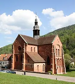 The building of the church is thought to have been begun about 1220; it was dedicated in 1262. The plan and basic structure are Romanesque but the vaulting shows Early Gothic influence. In accordance with Cistercian custom the church has no towers, just a flèche, or miniature spire, over the crossing, and the interior is without colour. The construction is of local red sandstone. The structure is of a pillared basilica of three aisles and a transept on a Latin cross ground plan. The vaults in the nave and the choir are secured by open buttresses. The resemblance to the church of Otterberg Abbey, which was built earlier, is unmistakable, although the church at Otterberg is larger.