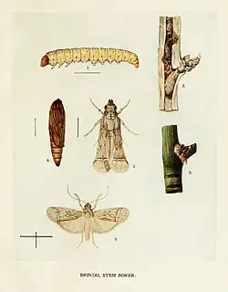 Their larvae are a pest on Solanum melongena (Solanaceae).[1]