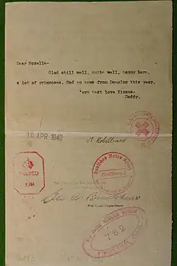 It was initially limited to 10 words per letter but was later changed to 25, which was the standard for prisoners-of-wars. The rules changed over the years; at one point, islanders were not permitted to write to relatives but could write to friends. The number of messages that one could send was limited, and replies had to be on the back of the original message. It might take months for a message to arrive although a few of them took only weeks. All messages were routed via the International Red Cross headquarters in Geneva, Switzerland, which dealt with 24 million messages during the war. The islands dealt with around 1 million messages, each of them costing 6d.[26]