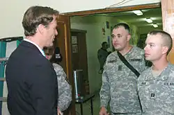 Bayh continued campaigning in Iowa during May, making appearances in Osceola, Council Bluffs, and Sioux City.[26] But polls of Iowa in June showed that the candidate had only single digit support.[27] In an attempt to improve his standing on the unpopular war in Iraq, Bayh along with many of his fellow potential Democratic presidential candidates, voted for a resolution that would set July 2007 as the deadline to remove American forces from the nation.[28] At the end of the month, Bayh traveled to Slidell, Louisiana to view the damage brought about by Hurricane Katrina the previous year. Stating that he "just want[ed] to help," Bayh became the first member of Congress outside of Louisiana to visit the site.[29] On a larger scale, Bayh commented on the rebuilding of the area, conveying that it "is a test of America".[30]