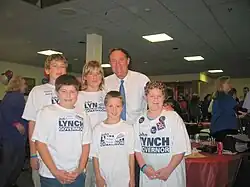 Bayh posing with a group of children in New Hampshire while making an appearance on behalf of John Lynch's gubernatorial campaign