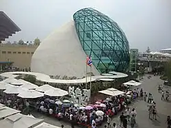Three of the five theme pavilions were located in the Central Exhibition Building constructed by the host country. Covering an area of 11.5 hectares, it is the largest exhibition structure in the history of World Expositions.[6] The building was located near the Expo Axis, in Zone B. The total exhibition space of this building was 80,000 m2. A 7,000 m2 multifunctional room in the building's center had an atrium in which some of the individual pavilions opened. Construction was completed in September 2009 before interior construction began.[7]