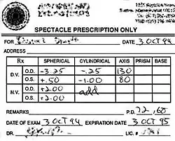 The parameters specified on spectacle prescriptions vary, but typically include the patient's name, power of the lenses, any prism to be included, the pupillary distance, expiration date, and the prescriber's signature. The prescription is typically determined during a refraction, using a phoropter and asking the patient which of two lenses is better, or by an automated refractor, or through the technique of retinoscopy. A dispensing optician will take a prescription written by an optometrist and order and/or assemble the frames and lenses to then be dispensed to the patient.