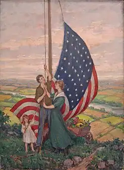 Artists were contacted by Charles Dana Gibson (1876 – 1944), of Gibson Girl fame, President of the Society of Illustrators. He had been assigned to the Division of Pictorial Publicity (DPP),[34] which was spearheading the production of war posters in New York City. Church was one of 55 artists[35] selected at the Salmagundi Club where the DPP met regularly. Five artists were assigned to each principle of the speech. The resulting sixty paintings were completed in less than three months, in time for the first fairs in August. These were divided into five circuits[36] and displayed to an estimated 8 million people that summer.