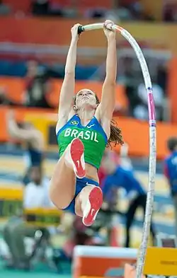 Fabiana de Almeida Murer (born 16 March 1981[1]) is a retired Brazilian pole vaulter. She holds the South American record in the event with an indoor best of 4.82 m and an outdoor best of 4.87 m, making her the fourth highest vaulter ever at the time, now the eighth. She won gold medals at the 2011 World Championships, 2010 World Indoor Championships, and 2007 Pan American Games. Murer represented Brazil at the 2008, 2012 and 2016 Summer Olympics. She is a four-time South American Champion with wins in 2006, 2007, 2009 and 2011. Murer was coached by both the Ukrainian Vitaly Petrov, who managed the world record holders Sergei Bubka and Yelena Isinbayeva, and her husband, Élson Miranda de Souza, a former pole vaulter himself.
