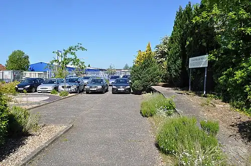Part of a platform from the station survives outside the car park of the Jewson builder's merchant, and the trackbed south of the platform is visible as a roadway.