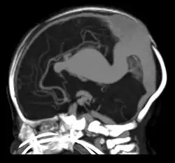 A falcine sinus is a venous channel that lies within the falx cerebri connecting the vein of Galen and the posterior part of superior sagittal sinus.[1] It is normally present during fetal development and involutes after birth. The presence of a falcine sinus has been associated with a vein of Galen malformation and other vascular anomalies. The persistence of a falcine sinus after the neonatal period was previously thought to be rare, but has recently been described to be present in up to 5% of all people,[2][1] appearings in approximately 2.1% of CT examinations of adult patients. Some authors have studied the plexus rather than the sinus, a rare form of the venous pathway between the layers of the cerebral falx, which connects the superior sagittal sinus with the inferior sagittal sinus and the straight sinus.[3]